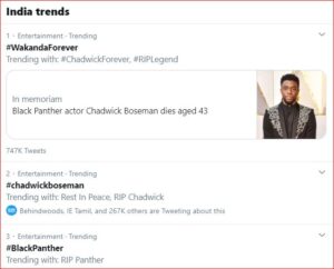 இவர் கடைசியாக ஆகஸ்ட் 12-ம் தேதி அமெரிக்க தேர்தலில் துணை அதிபராக போட்டியிட உள்ள கமலா ஹாரிஸை வாழ்த்தி ட்விட்டரில் பதிவிட்டிருந்தார். இவரது மறைவுக்கு பிரபலங்கள் ட்விட்டரில் அஞ்சலில் தெரிவித்து வருகின்றனர். கருப்பின மக்களின் சூப்பர் ஸ்டாராக வலம் வந்த சட்விக் போஸ்மேனுக்கு ரசிகர்களும் தங்கள் வேதனையை ட்விட்டரில் பல ஹேஷ்டேக்குகளை போட்டு தெரிவித்து வருகின்றனர்.