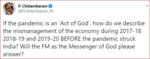 மேலும் இந்தியாவில் தொடர்ந்து பெட்ரோல் விலை அதிகரித்து வருகிறது. இந்நிலையில் காங்கிரஸ் முன்னாள் நிதி அமைச்சர் ப.சிதம்பரம் கூறும் போது “தொற்றுநோய் கடவுளின் செயல்’ என்றால், தொற்று நோயைத் தாக்கும் முன் இந்தியா 2017-18, 2018-19 மற்றும் 2019-20 காலங்களில் இருந்த பொருளாதாரத்தின் தவறான நிர்வாகத்தை எவ்வாறு விவரிப்பது? “கடவுளின் தூதராக உள்ள நிதி அமைச்சர் தயவுசெய்து பதிலளிப்பாரா?” என கேள்வி எழுப்பி உள்ளார்.