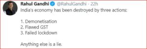 காங்கிரஸ் எம்.பி. ராகுல்காந்தி நாட்டின் பொருளதார வளர்ச்சி மோசமாகி வருவது குறித்து மத்திய அரசு பொருளாதாரத்தை தவறாகக் கையாண்டுவருவது குறித்தும் தொடர்ந்து விமர்சித்து வருகிறார். காங்கிரஸ் முன்னாள் தலைவரும், எம்.பியுமான ராகுல்காந்தி டுவிட்டரில் பதிவிட்ட கருத்தில் “நாட்டின் பொருளாதாரம் 3 செயல்களால் அழிக்கப்பட்டது. முதலாவதாக பணமதிப்பிழப்பு நடவடிக்கையால் அழிக்கப்பட்டது. இரண்டாவதாக தவறான ஜி.எஸ்.டி வரிக் கொள்கையால் பொருளாதாரம் அழிக்கப்பட்டது. மூன்றாவதாக கொரோனாப் பரவலைக் கட்டுப்படுத்த கொண்டுவரப்பட்ட ஊரடங்கு நடவடிக்கையை தவறாகக் பயன்படுத்தியதால், பொருளாதாரம் அழிந்தது” என தனது கருத்தை தெரிவித்துள்ளார்.
