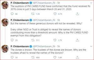 இதுகுறித்து காங்கிரஸ் மூத்த தலைவர் ப.சிதம்பரம் தனது ட்விட்டர் பக்கத்தில் மத்திய அரசுக்குக் கேள்வி எழுப்பியுள்ளார். “பிஎம் கேர்ஸ் நிதி தொடங்கப்பட்டதிலிருந்து 2020, மார்ச் 27 முதல் 31-ம் தேதிவரை 5 நாட்களில் ரூ.3,076 கோடி நிதி வந்துள்ளது என பிஎம் கேர்ஸ் தணிக்கையாளர்கள் உறுதி செய்துள்ளார்கள்.