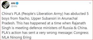 இந்நிலையில் சமீபத்தில் இந்தியாவின் மத்திய பாதுகாப்பு துறை அமைச்சர் ராஜ்நாத் சிங் ரஷ்யாவில் சென்று ரஷ்ய மற்றும் சீனாவின் பாதுகாப்பு அமைச்சர்களை சந்தித்து பேசியுள்ளார். இதனை தொடர்ந்து சீனாவின் பி.எல்.ஏ (மக்கள் விடுதலை இராணுவம்) அருணாச்சல பிரதேச பகுதியில் உள்ள மேல் சுபன்சிரியின் நாச்சோ எனும் இடத்தை சேர்ந்த 5 சிறுவர்களை கடத்திச் சென்றுள்ளது.