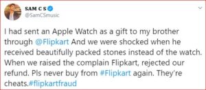 அவர் கூறியதாவது: “என்னுடைய சகோதரனுக்கு பிறந்த நாள் பரிசாக கொடுக்க ஆப்பிள் வாட்ச் ஒன்றை ஆன்லைனில் ஆர்டர் செய்திருந்தேன். அது வந்த போது அதை திறந்து பார்த்து அதிர்ச்சியானோம். அதில் கற்களை மிக அழகாக பேக் செய்து அனுப்பி இருந்தார்கள். அது பற்றி சம்பந்தப்பட்ட ஆன்லைன் வர்த்தக நிறுவனமான பிளிப்கார்ட்டில் புகார் அளித்த போது அவர்கள் எங்களது புகாரை நிராகரித்து, பணத்தை திருப்பித் தர முடியாது என கூறி விட்டனர். இதனால் தயவு செய்து அந்த நிறுவனத்திலிருந்து வாங்காதீர்கள். அவர்கள் ஏமாற்றுக்காரர்கள்” என சாம்.சி.எஸ் அந்நிறுவனத்தை கடுமையாக சாடியுள்ளார்.