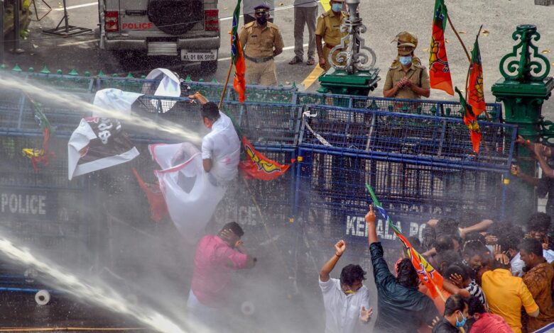 கேரள அமைச்சர் பதவி விலக வலியுறுத்தி பாஜகவினர் போராட்டம்; காவல்துறையினர் தண்ணீரை பீய்ச்சி அடித்து விரட்டியடித்தனர்