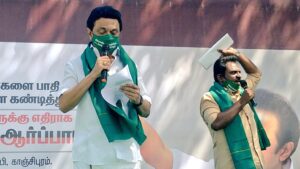 அந்த வகையில், காஞ்சிபுரம் கீழ் அம்பியில் விவசாயிகளுக்கு ஆதரவாக பச்சை துண்டு, மாஸ்க் அணிந்து ஸ்டாலின் ஆர்ப்பாட்டத்தில் களமிறங்கி பேசிய அவர், “விவசாயிகளை ஏமாற்றி வரும் விஷப்பாம்புதான் எடப்பாடி பழனிசாமி. குடிமராமத்து திட்டத்தைக் காட்டி பணத்தை கொள்ளை அடிக்கும் எடப்பாடி விவசாயியா?, கிசான் திட்டத்தில் பணத்தை கொள்ளையடித்த எடப்பாடி பழனிசாமி விவசாயியா?விவசாயக்கடன்களை ரத்து செய்யக்கூறிய உயர்நீதிமன்ற தீர்ப்பை எதிர்த்து உச்சநீதிமன்றம் சென்ற பழனிசாமி விவசாயியா? என்று கேள்வி எழுப்பினார்.