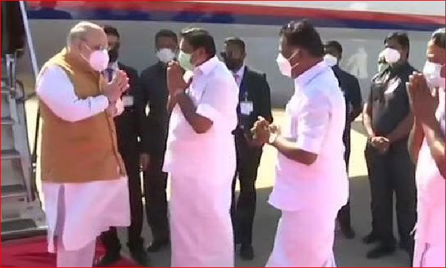சென்னை வந்த மத்திய உள் துறை அமைச்சர் அமித் ஷாவை முதல்வர் பழனிசாமி, அமைச்சர்கள், பாஜக தலைவர்கள் உள்ளிட்டோர் வரவேற்றனர்.