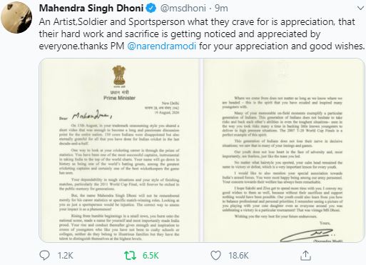 சர்வதேச கிரிக்கெட்டிலிருந்து ஓய்வு பெற்ற மகேந்திர சிங் தோனிக்கு வாழ்த்து தெரிவித்து பிரதமர் நரேந்திர மோடி கடிதம் எழுதியுள்ளார்.