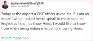 இது தொடர்பாக தமது டிவிட்டர் பக்கத்தில், தனது விமான நிலைய அனுபவத்தைப் பகிர்ந்து கொண்ட கனிமொழி, “இன்று விமான நிலையத்தில் ஒரு சிஐஎஸ்எஃப் காவலரிடம், எனக்கு இந்தி தெரியாது என்பதால் ஆங்கிலம் அல்லது தமிழ் மொழியில் பேச முடியுமா என கேட்டபோது, அவர், “நீங்கள் இந்தியரா?” என்று என்னிடம் கேட்டுள்ளார். இந்தி மொழி தெரிந்தால் தான், இந்தியனாக இருப்பதற்கு சமம் என்பது எப்போதிலிருந்து உள்ளது என்பதை அறிய விரும்புகிறேன்” என்று குறிப்பிட்டுள்ளார்.