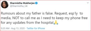 அவர் தனது ட்விட்டர் பக்கத்தில் , “என் தந்தையை பற்றி வரும் தகவல்கள் வெறும் வதந்தியே! செய்திநிருவனங்களிடம் தயவுசெய்து தொந்தரவு செய்ய வேண்டாமென கேட்டுகொள்கிறேன். மருத்துவமனையில் இருந்து தகவல் எப்போது வந்தாலும் உங்களுக்கு தெரியபடுத்துகிறேன்.” என்று தெரிவித்துள்ளார்.